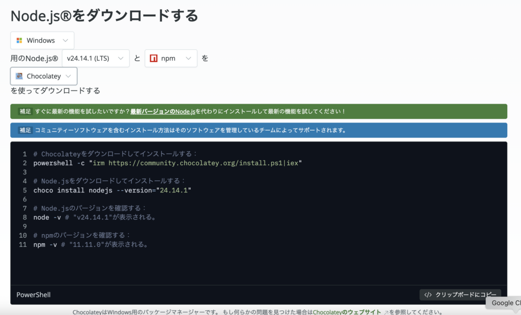 https://nodejs.org/ja/download からダウンロードしてください。自分の環境を選び、コマンドを1つずつ実行してください。まずWindowsかMacを選べばあとはそのままでいいでしょう。