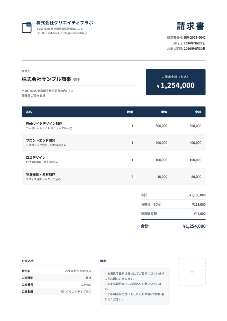 freeeやMisocaがなくても、この品質の請求書がプロンプト一発で出てきます。A4サイズで印刷に最適化済み。Cmd+P(WindowsならCtrl+P)でそのままPDFに書き出せます。