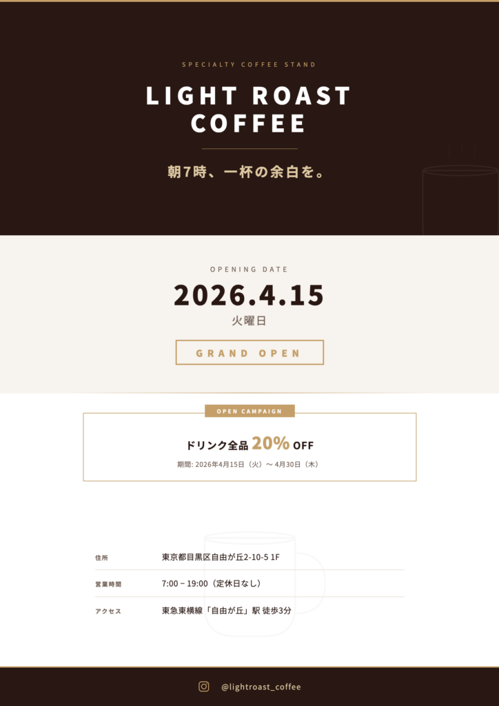 20- 中央: オープン日を目立たせる(大きいフォント、ゴールド系 #c8a96e のアクセント)
