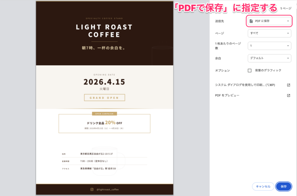 1A4ぴったりのPDFにしたいので、それ用のCSSも書いてください。印刷画面はこんな感じ。「PDFに印刷」を選択してください。