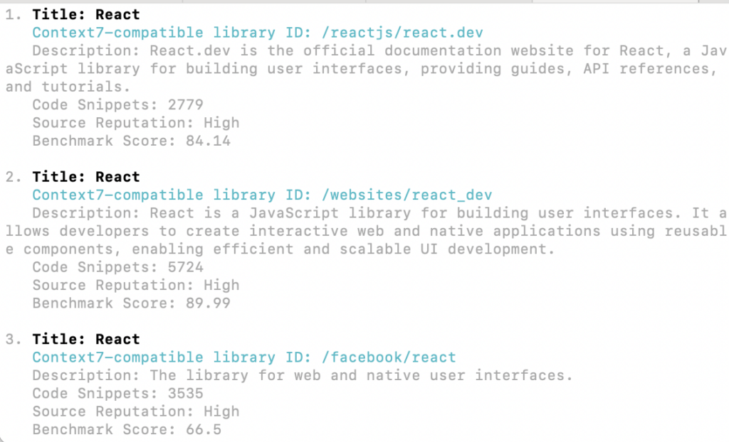 1npx ctx7 library react "useEffectのクリーンアップ"ライブラリ名と質問を渡すと、Context7がマッチするライブラリの一覧とIDを返してくれます。